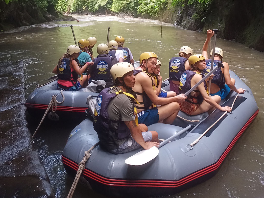 Erleben Sie Nervenkitzel und Natur pur beim Rafting auf dem Ayung-Fluss in Ubud. Die 12 km lange Strecke mit Stromschnellen der Klassen II–III ist ideal für Anfänger und bietet Wasserfälle, Dschungelkulisse und einzigartige Skulpturen entlang der Felswände.