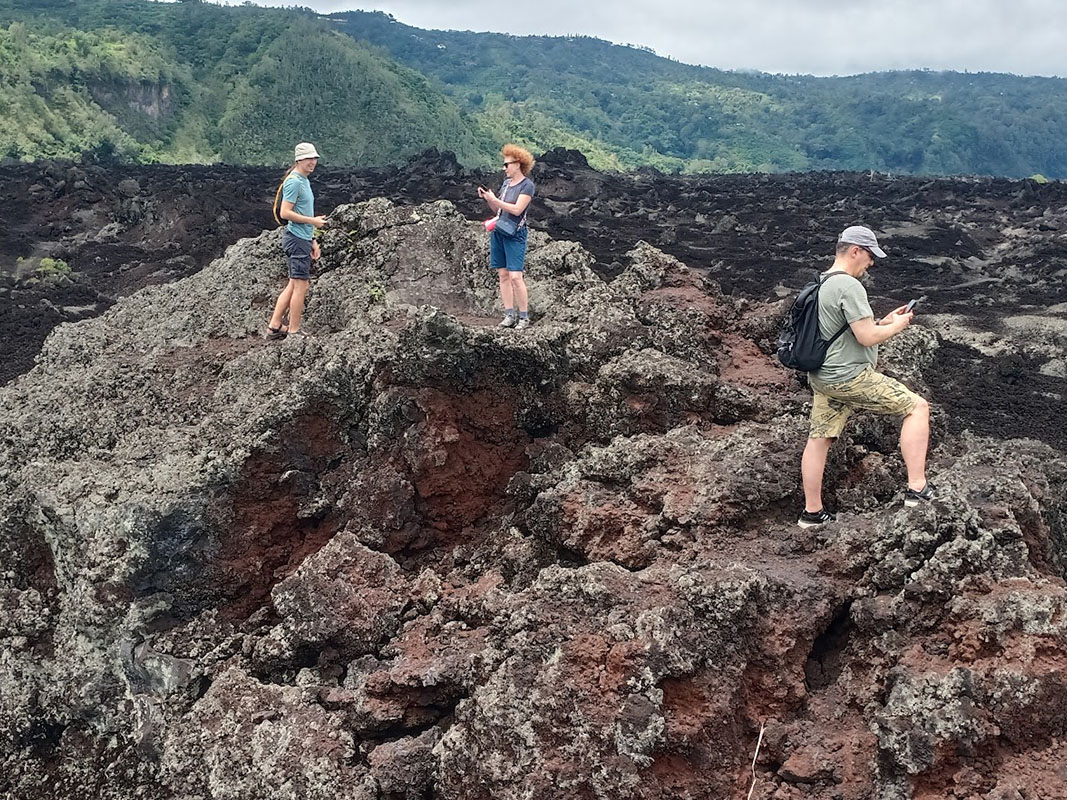 Erkundung des dramatischen schwarzen Lavafeldes am Fuße des Vulkans.